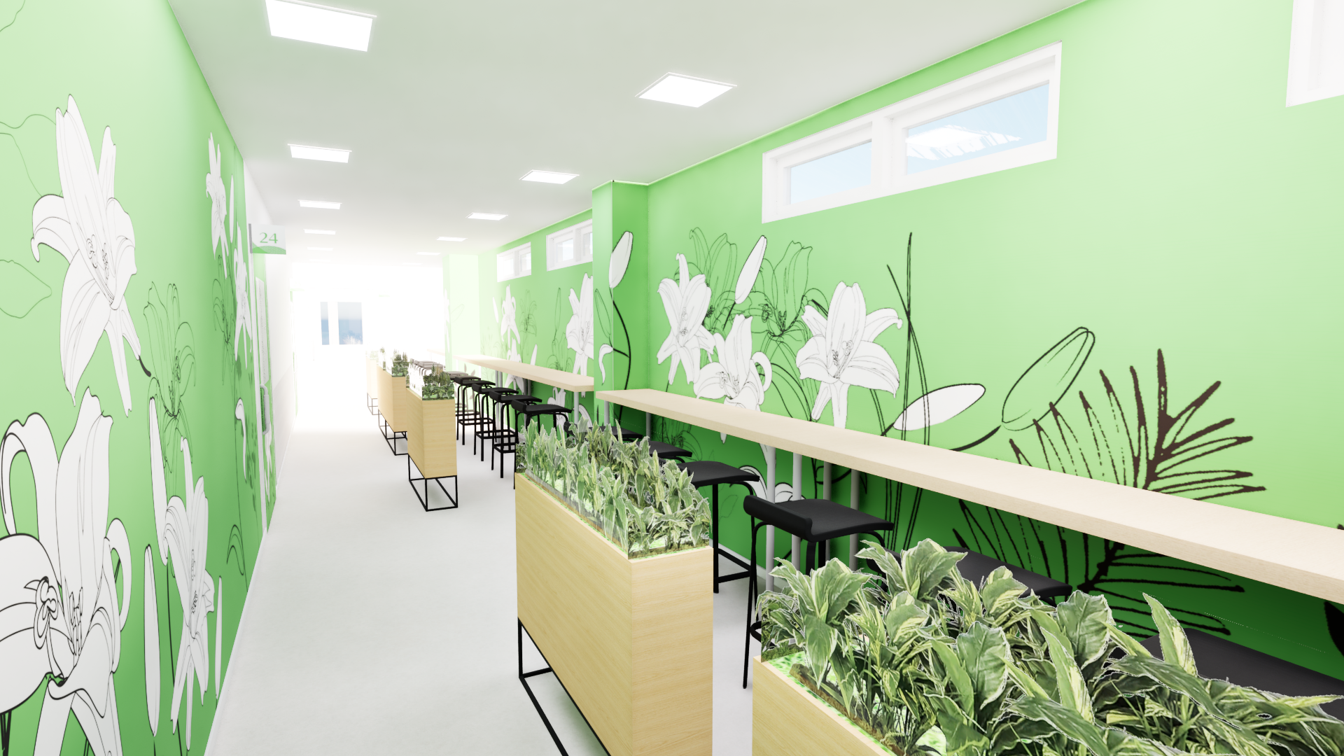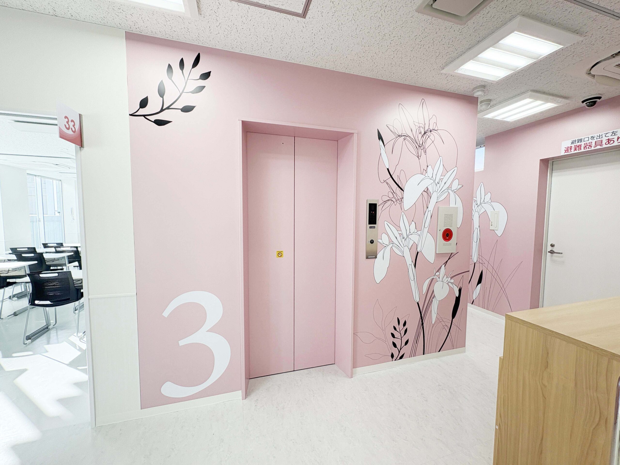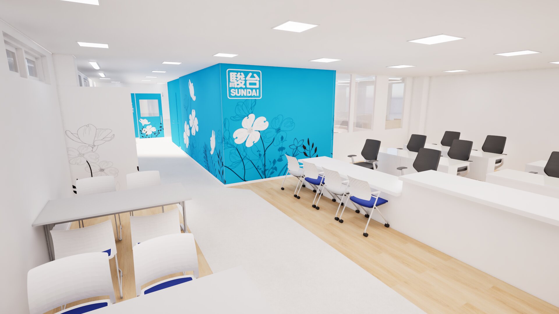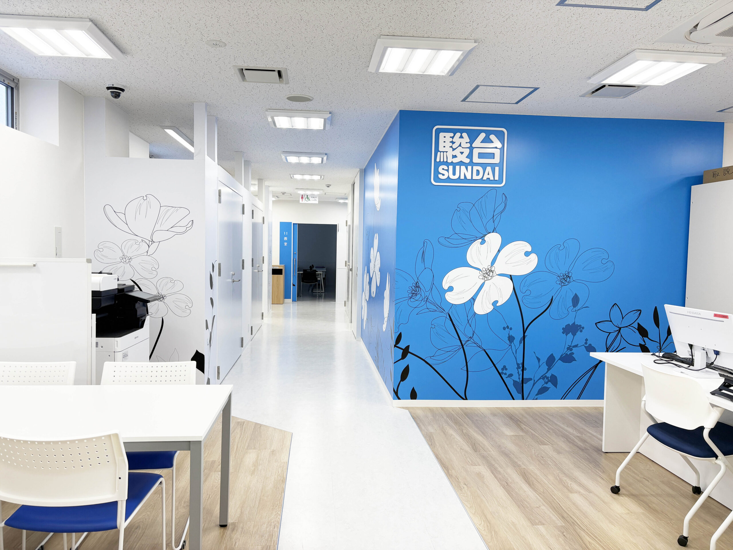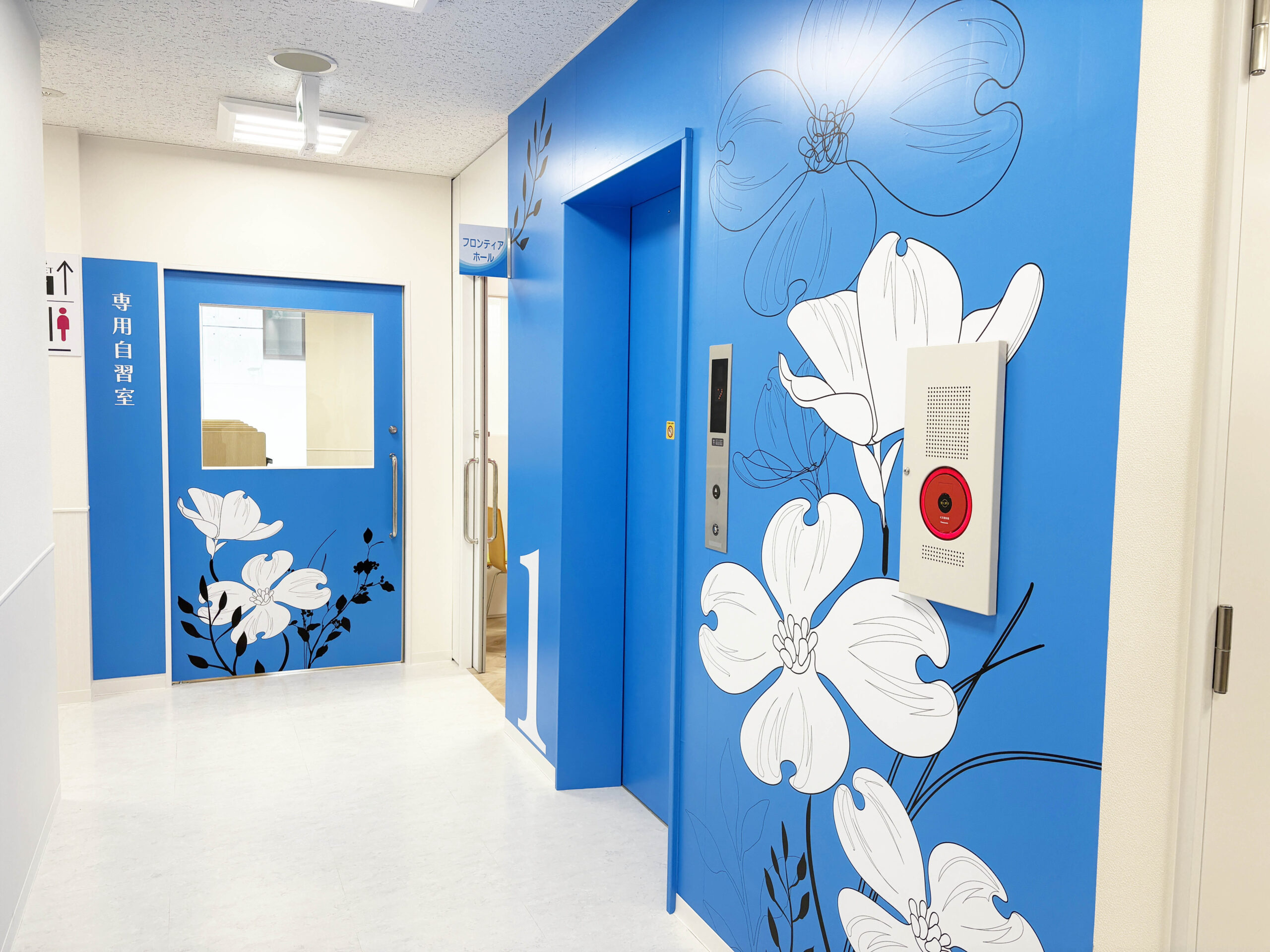 イメージパースと図面での最終確認を経て、 今回、学習塾が運営される地域に、ゆかりのあるお花をそれぞれ、1F~3Fに採用。 満開に咲き誇る花のデザインで、空間全体に華やかな印象と ご利用される生徒さまやご家族さまに明るい印象を持って頂けるような空間をイメージしました。 またご要望のあった専用自習室や休憩スペース・面談室を設けることで 学習や打合せのしやすい環境を設計することができました。