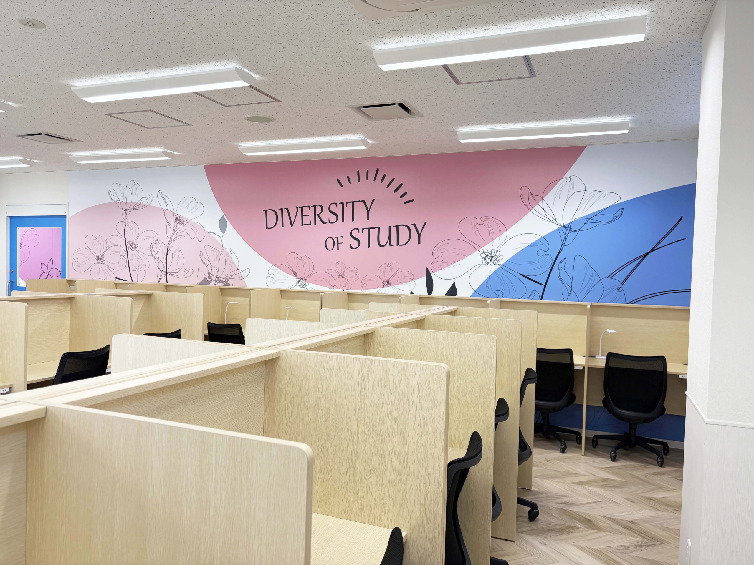 壁面デザインが印象に残る、明るく活気のある学習塾に
